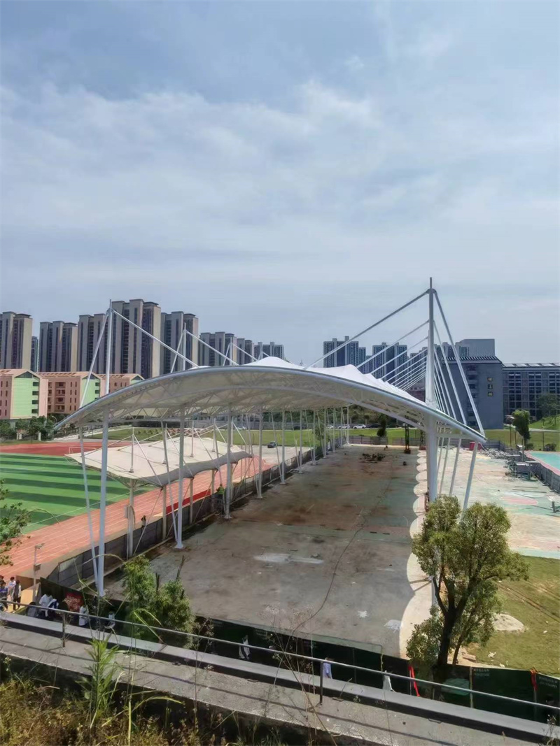 核心功能与优势 高效遮阳防晒,保障运动安全:优质膜材可有效过滤大部分紫外线,减少阳光直射带来的眩光与高温,降低运动中中暑、皮肤灼伤的风险;漫射透光设计让棚下明亮柔和,减少白天人工照明消耗。曲面造型能快速排水,避免积水损坏场地,兼顾遮阳与短时防雨需求。 大跨度无柱设计,释放运动空间:可实现大跨度无中间立柱的覆盖,不遮挡视线、不影响跑动与球类运动轨迹,保留球场完整使用面积,尤其适合篮球场、网球场、羽毛球场等。整体自重轻,对地基要求低,施工周期较传统混凝土顶棚更短,减少对场地正常使用的影响。 耐用抗风,维护便捷:膜材表面经特殊涂层处理,具备良好的耐候性与自洁能力,雨水冲刷即可带走大部分灰尘;配合合规的抗风、抗雪荷载设计,可适应多数地区的日常天气。常见的 PVC 膜材、PTFE 膜材均有明确的长期使用年限,日常无需频繁保养。 造型灵活,适配多元场景:可定制鞍形、拱形、伞状等多种曲面造型,膜材颜色丰富,能与学校、社区、体育公园、商业运动场馆的周边环境协调融合,提升场地的现代感与美观度。 常见结构类型 张拉式:通过钢索与桅杆张拉膜面,造型轻盈流畅,适合大跨度球场; 骨架式:以钢结构为骨架覆盖膜材,稳定性强,适合对耐用性要求高的公共场地。 适用场景 学校操场、社区篮球场 / 网球场、体育公园、企业运动区、专业培训机构场地等各类户外体育场地的遮阳防雨改造或新建项目。
